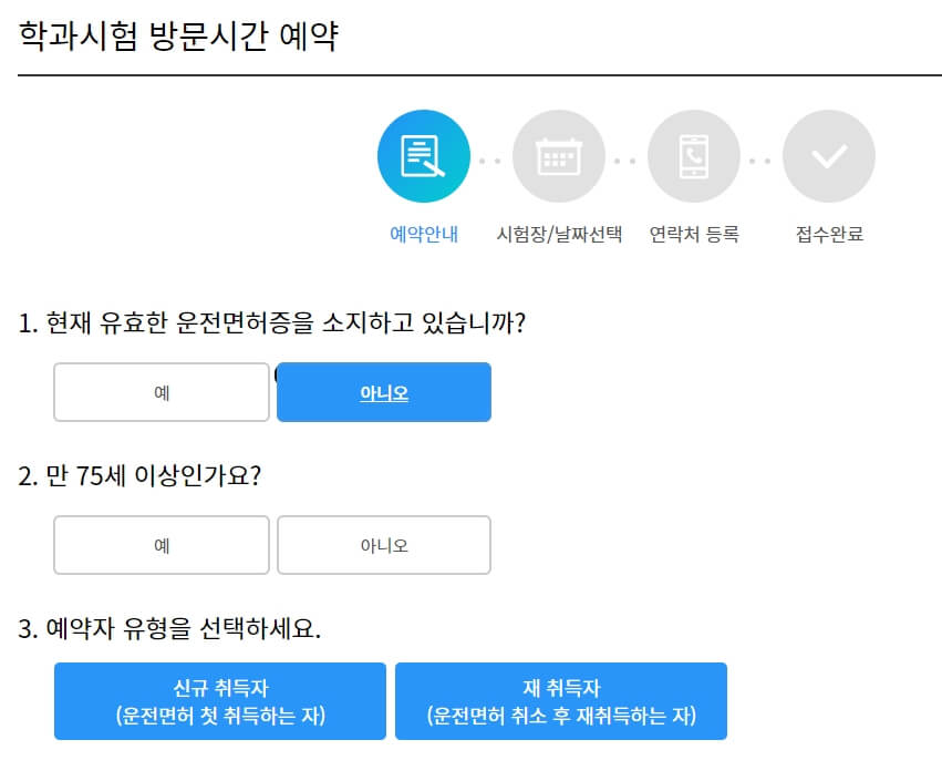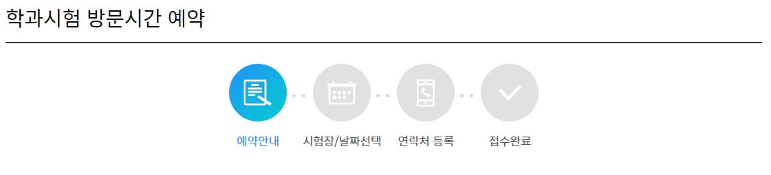 이제 본격적으로 운전면허 필기시험 접수 방법에 대해서 확인해보겠습니다. 크게 4단계로 구성되어 있는 것을 확인 할 수 있습니다. 첫 단계는 역시 기본적인 예약안내 사항입니다.
