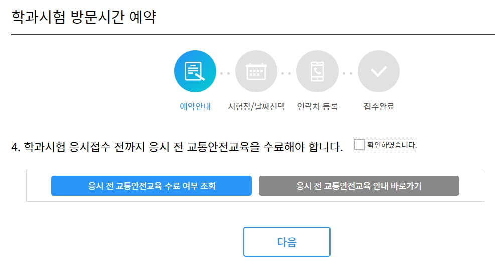 다음과 같이 예약 안내 사항 중에 교통 안전 교육 수료 여부를 확인하고 있습니다. 이는 필기 시험을 수행하기 전에 꼭 강의 수료를 완료 해야 필기 시험 응시도 가능 하다는 점입니다.
