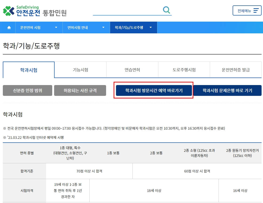 다음과 같은 홈페이지 경로를 통해서, 운전 면허 학과 시험에 대한 정보 확인 부터 시험 접수를 할 수 있는 페이지로 이동이 가능합니다. 해당 메뉴 "학과 시험 방문시간 예약 바로가기" 버튼을 클릭해주세요.
