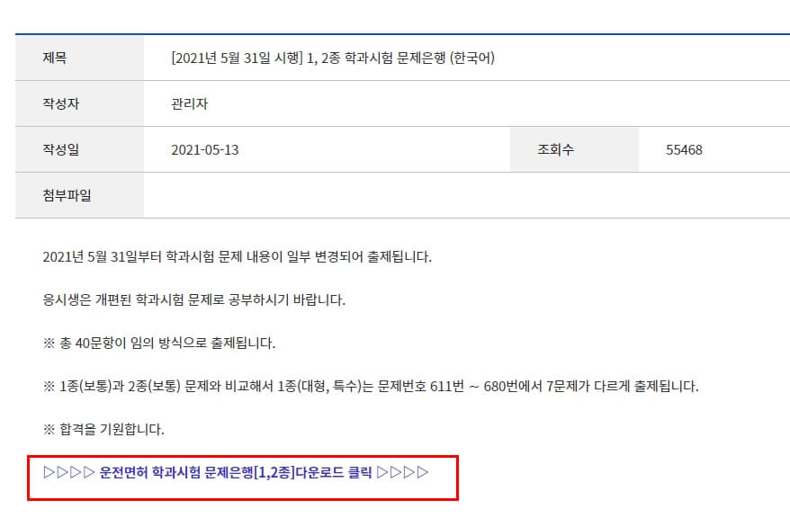 혹시 해당 면허 필기 시험 문제집이 다운로드 되지 않는 분을 위해서 아래 1,2종 필기 학과 시험 문제은행 파일을 함께 공유드립니다. 필요 하신 분은 다운로드 하여 활용해보세요.