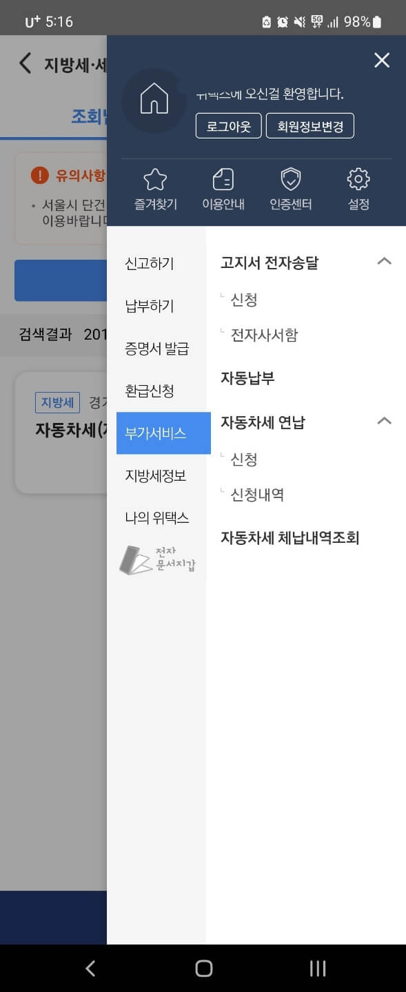 우측에 있는 메뉴 보기를 클릭하고, 부가서비스 > 자동차세 연납 > "신청"하기 버튼을 클릭해주세요. 그럼 다음과 같은 화면이 노출되는 것을 확인할 수 있습니다.