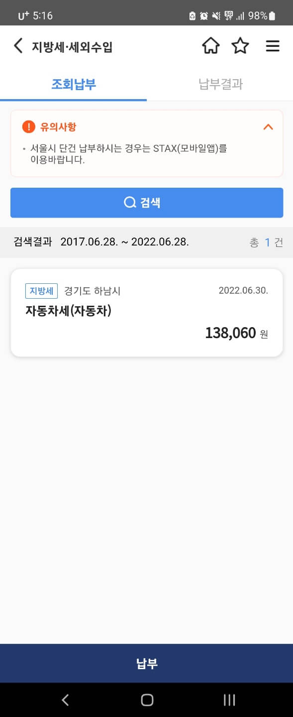 기본적으로 납부해야 하는 자동차세를 우선 확인해보았습니다. 2022년 6월 30일까지 납부해야하는 차량에 세액을 138,060원입니다.