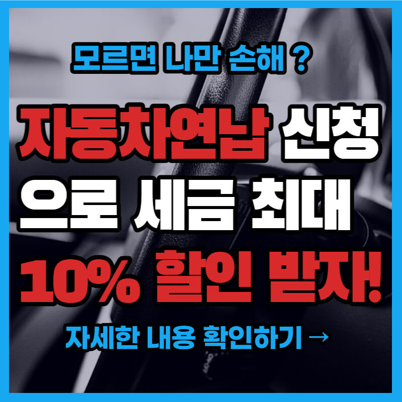 자동차를 구매하면 매년 자동차세(세금)를 지불해야 한다. 청구된 금액을 지불하면 이제 손해다! 사전에 세금을 미리 납부하면 빨리 할수록 높은 할인율을 적용받는다. 오늘은 자동차세를 연납신청 해서 최대 10%까지 할인받는 방법을 알아보겠습니다. 해당 글을 끝까지 읽으시면, 오늘 치킨값 벌어가십니다.