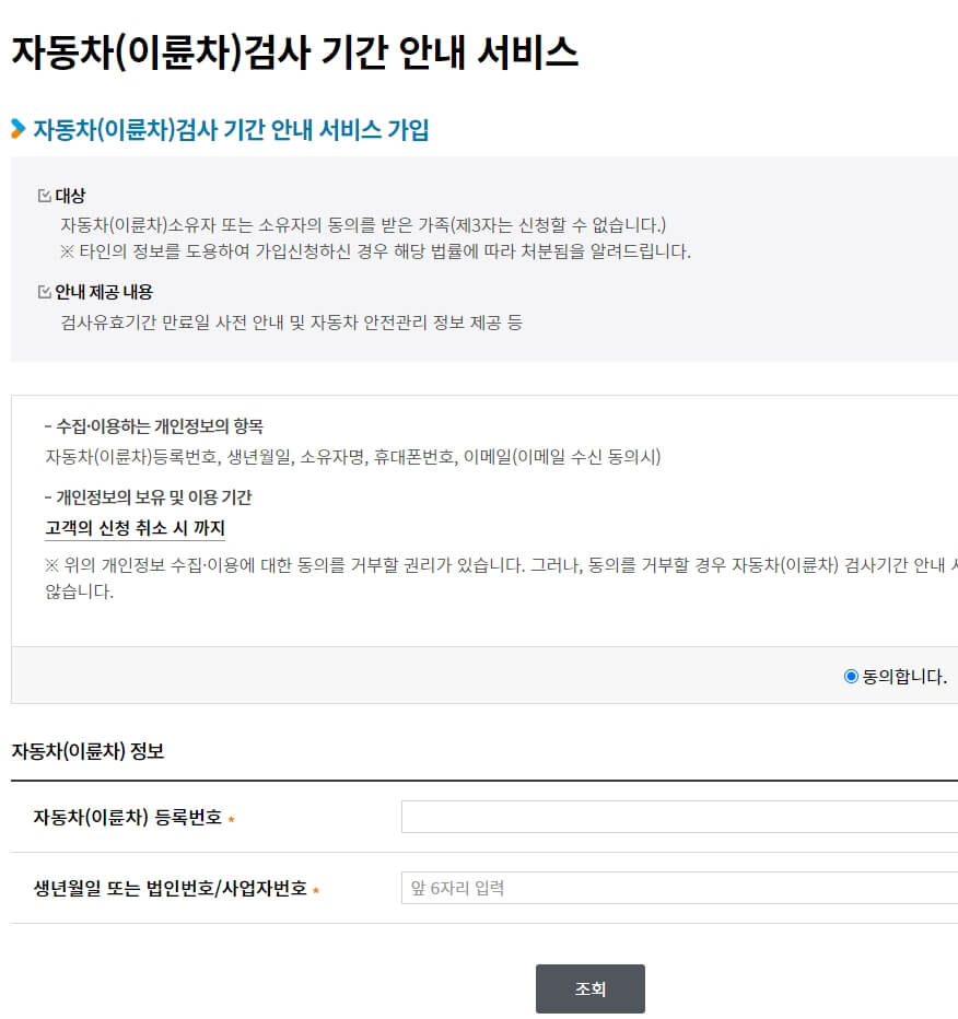 기본적인 약관 동의와 함께 검사 차량 조회 정보를 입력해야 합니다. 자동차 등록번호 or 차량 번호와 해당 자동차 차량에 주민등록 번호를 입력해서 조회하시면 됩니다.