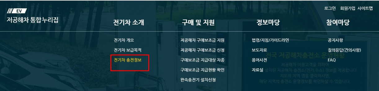 본격적으로 해당 포스팅에 주요 목적인 전기차 충전요금에 대해서 확인해보겠습니다. 전기차 소개 하위에 전기차 충전정보 메뉴를 클릭해주세요. 해당 메뉴를 클릭하면 다양한 충전 관련 정보를 확인 할 수 있습니다.