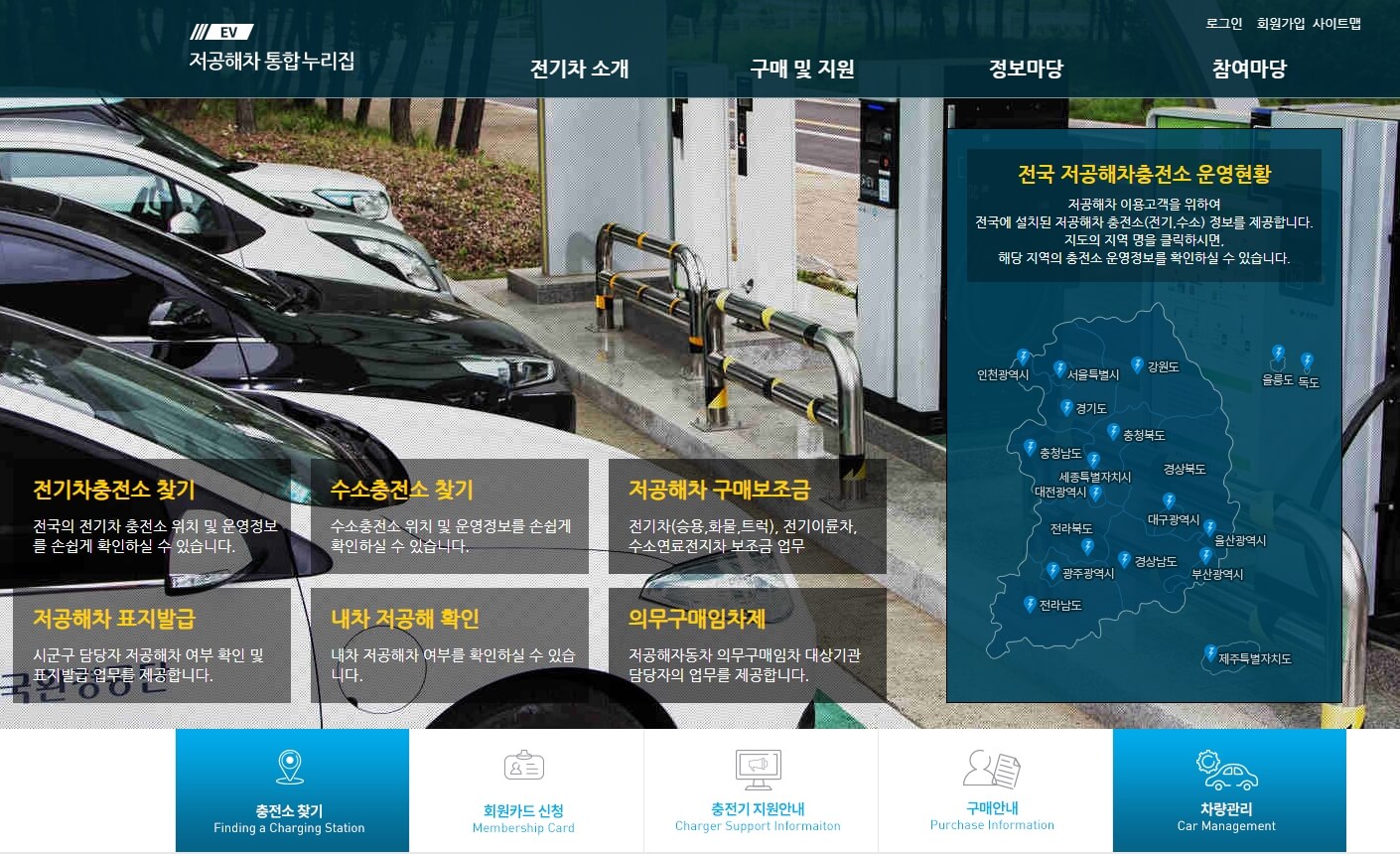 해당 홈페이지에 접속하시면 아래와 같은 메인화면을 확인 할 수 있습니다. 전기차 충전소찾기 부터 구매보조금까지 메뉴 별로 확인 할 수있습니다.