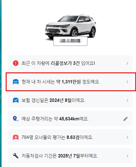 현재 내차시세에 대해서 만원 단위까지 자세하게 출력되는 것을 확인할 수 있죠. 이왕이면, 중고차로 판매하려는 시점에 조회하는 것이 좋겠죠? 시간 경과에 따라서 해당 차량에 가격을 다시 감소할 수 있기 때문이죠.