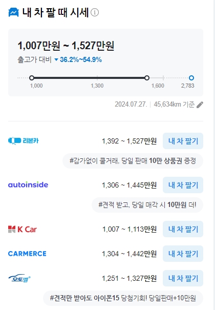 그래서, 리본카, autoinside, 케이카, carmerce, 오토벨과 같은 다양한 중고차 매입 회사에서 매입이 가능한 가격선을 확인할 수 있는 서비스 또한 제공하고 있습니다. 개인적으로는 해당 부분이 참 유용하게 활용될 수 있다고 생각되더라고요. 아래 리스트에서 바로 확인 가능합니다.