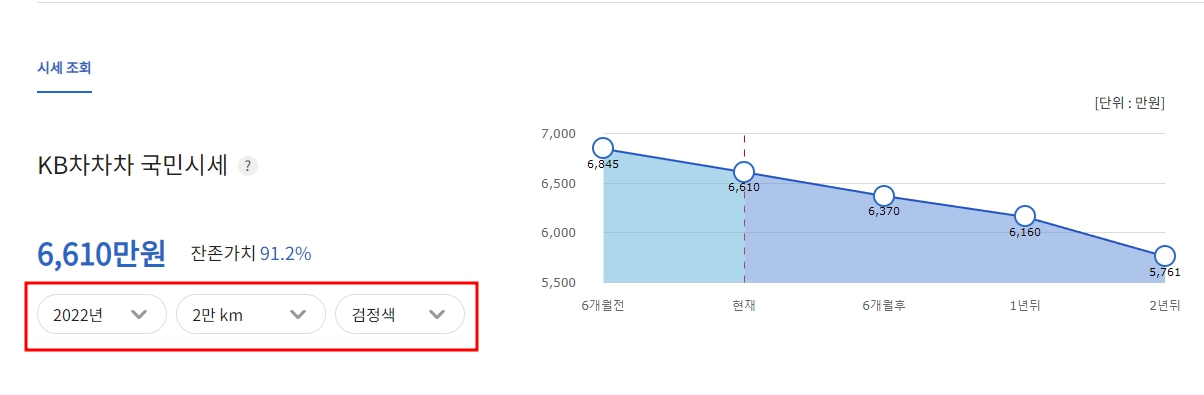 6,610만 원에 시세를 확인할 수 있고, 해당 플랫폼에서는 2년 뒤에 차량 가격이 변동되는 예상 기준까지 정보를 제공해주고 있네요.