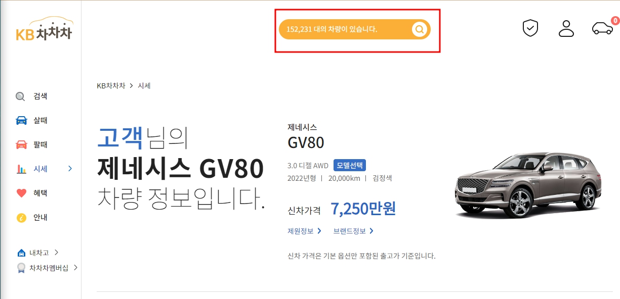 KB 차차차에 152,231대의 차량이 등록된 정보 기준으로 제공되는 중고차시세 정보도 확인해 보겠습니다. 엔카와 동일한 조건을 등록하면 아래와 같이 제네시스 GV80 2022년식에 20,000km 주행거리 차량에 중고차 시세 정보를 확인할 수 있습니다.