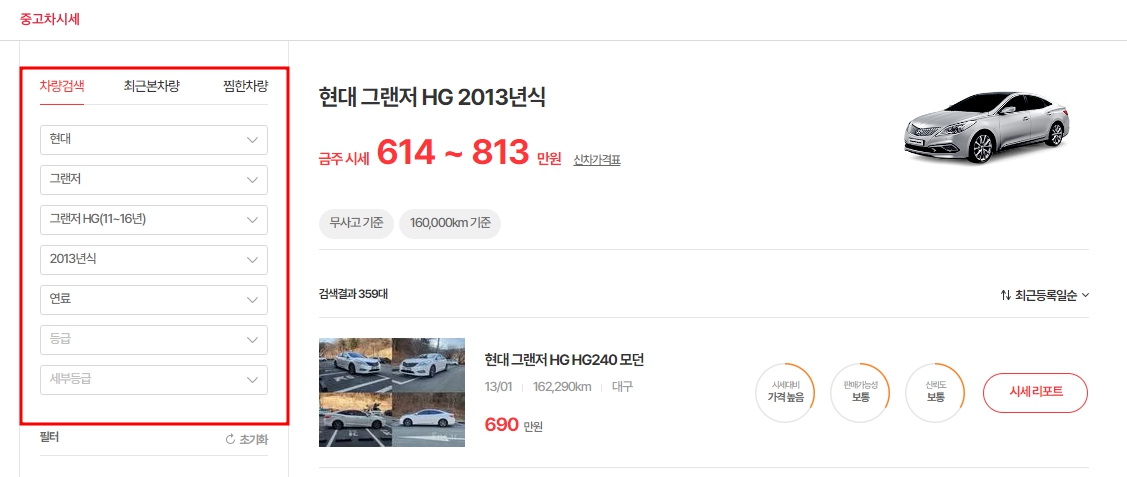 브랜드, 차종, 연식, 연료, 등급 등에 세부적인 항목을 선택해 주시면 해당 정보 기준으로 중고차 시세를 확인할 수 있습니다. 상당히 쉽죠?