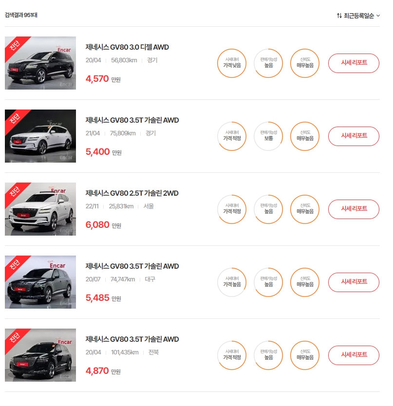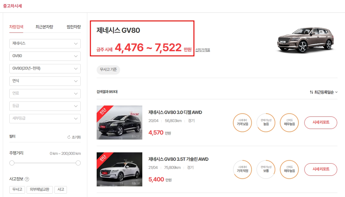 개인적으로 구매하고 싶은 제네시스 GV80 차량을 검색해 본 결과는 아래와 같네요. 현재 글작성 기준으로 4,476만 원~7,522만 원으로 중고차 금주 시세가 선정되어 있습니다.