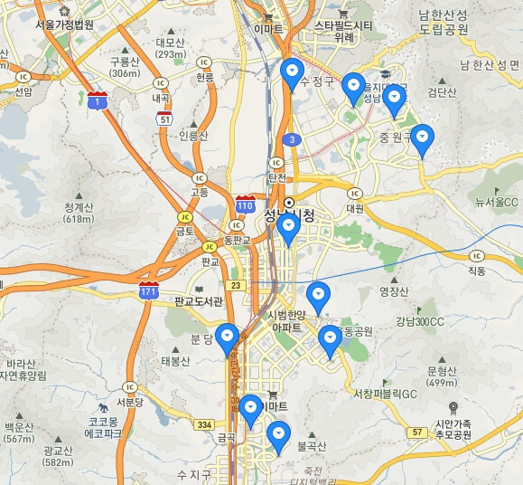 키워드 기반으로 검색 기능으로 조회 하셧다면 다음과 같이 지도 UI 기준으로 주변에 있는 현대자동차 AS 서비스센터에 대해서 모두 확인 할 수 있습니다. 예상은 하셔겠지만, 파란색 표기 되어 있는 곳이 서비스 센터를 의미합니다. 그리고 자세한 정보를 확인하기 위해서 해당 표시를 선택하시면 됩니다.