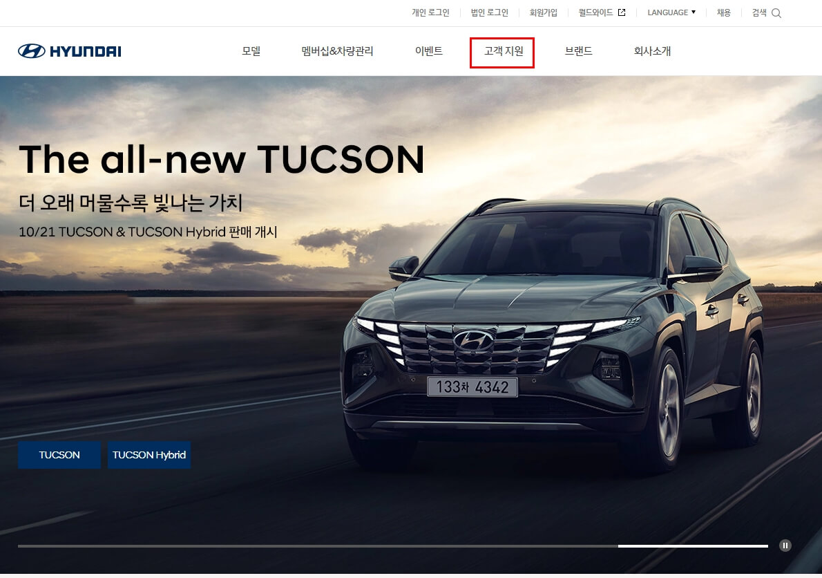 해당 사이트에 접속하여 상단에 있는 1뎁스 메뉴 중에서 "고객지원" 이라고 명칭되어 있는 메뉴를 클릭해주시면됩니다.