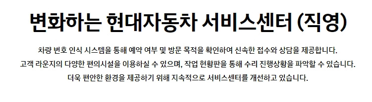 해당 메뉴를 클릭하셨다면 아래와 같은 현대자동차 서비스센터 직영점 이용 방법을 안내하는 페이지로 접속 및 이동 하는 것을 확인 할 수 있습니다. 대한민국에 대표적인 자동차 브랜드에 서비스 센터는 역시 다릅니다.