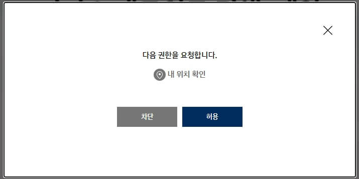 그러기 때문에, 해당 홈페이지에서는 위치 기반 서비스를 이용 할 수 있도록 현재 사이트에 접속한 PC 기준에 위치를 확인하여 활용 할 수 있는 권한 여부를 선택 하도록 합니다.